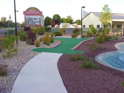 | 17th hole - is a dogleg to the left , but watch out for the rough in front of the hole on the left hand side. Maybe after we get done playing we can catch a movie ? Let's see what's playing ? And we're almost done because the clubhouse is in sight. | |